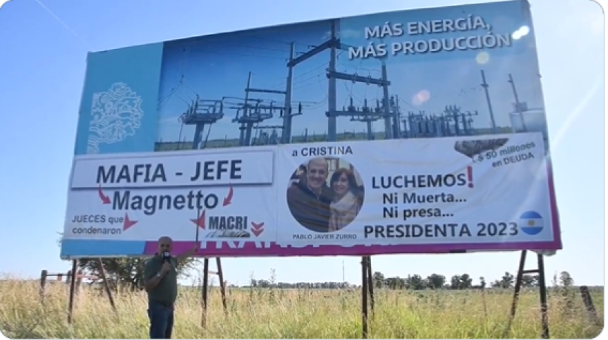 Zurro colocó un cartel a la vera de la Ruta 5 para apoyar a Cristina y criticar a medios y oposición