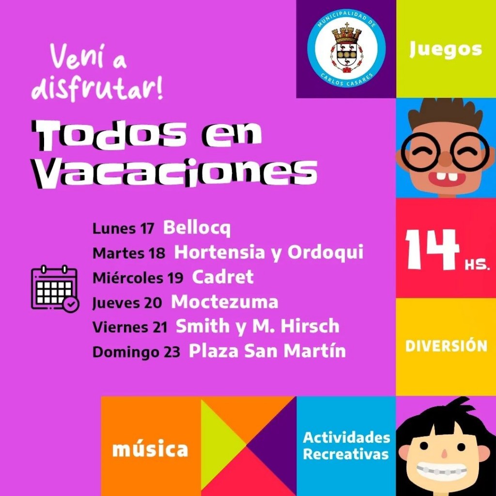 Del lunes 17 al viernes 21, nos trasladaremos a la zona rural. El lunes estaremos en Bellocq, martes en Hortensia y Ordoqui, miércoles en Cadret, jueves en Moctezuma y viernes en Smith y Mauricio Hirsch. Y para cerrar la semana, el domingo 23 a las 14 hs. nos encontraremos en la plaza San Martín para disfrutar de juegos, diversión, música y actividades recreativas.